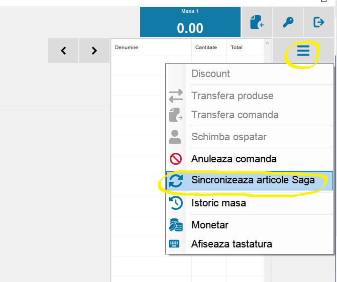 Se da click pe o masa - optiuni ( in dreapta ) - sincronizeaza articole SAGA